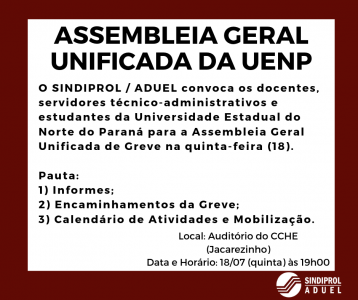 A mesa da plenária foi composta por Ronaldo Gaspar, presidente do Sindiprol/Aduel, e Fernanda Amorim dos Santos, estudante de pedagogia e representante do movimento estudantil. Nela, foi constituída uma comissão para redigir um documento final que vai ser apresentado às categorias e à comunidade com as discussões levantadas no seminário.