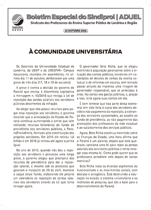 [mk_page_section min_height=”0″ padding_top=”0″ top_shape_color=”#ffffff” bottom_shape_color=”#ffffff” sidebar=”sidebar-1″][vc_column][mk_image src=”http://200.155.33.83/~sindiproladuel/wp-content/uploads/2016/10/cabecalho-padrao-boletins.jpg” image_size=”full” align=”center”][/vc_column][/mk_page_section][mk_page_section padding_top=”0″ padding_bottom=”0″ sidebar=”sidebar-1″][vc_column][mk_fancy_title size=”30″ font_weight=”bold” txt_transform=”uppercase” margin_bottom=”10″ font_family=”none” align=”center”]À COMUNIDADE UNIVERSITÁRIA[/mk_fancy_title][/vc_column][vc_column][vc_column_text]Os Docentes da Universidade Estadual de Londrina, da UENP e da UNESPAR- Campus Apucarana, reunidos em assembleias, no ultimo dia 11 de outubro, deliberaram por uma greve de três dias (17, 18 e 19 de outubro).