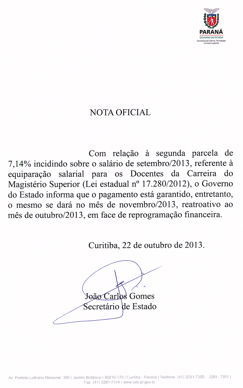 O titular da SETI, João Carlos Gomes (PSDB), que assina o texto, não teve a preocupação de justificar o anúncio e atribuiu o atraso a uma “reprogramação financeira”. O secretário também afirma que o pagamento será retroativo ao mês de outubro.