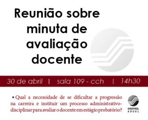 A primeira cria “critérios de avaliação para ascensão interníveis e promoção interclasse dos docentes”; a outra regulamenta a “avaliação especial de desempenho para o estágio probatório da carreira docente”. Por isso o Sindiprol/Aduel convida professores em estágio probatório para discussão da proposta, na próxima terça-feira, às 14h30, na sala 109 no CCH.