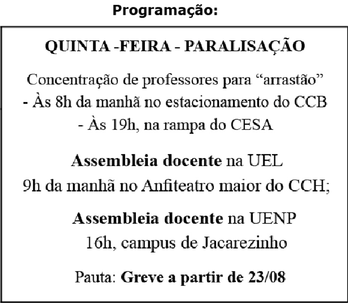 O Sindiprol/Aduel convoca todos os professores para a assembleia docente nesta quinta-feira, às 9h da manhã no Anfiteatro Maior do CCH. Pauta: greve a partir do dia 23 de agosto. No mesmo dia as aulas de todas as IEES estarão paralisadas com a finalidade de pressionar o governo do Estado a enviar o projeto de lei da equiparação salarial dos técnicos de nível superior com os docentes à Assembleia Legislativa, apressar a sua aprovação e sancionar a lei, publicando-a no diário oficial.
