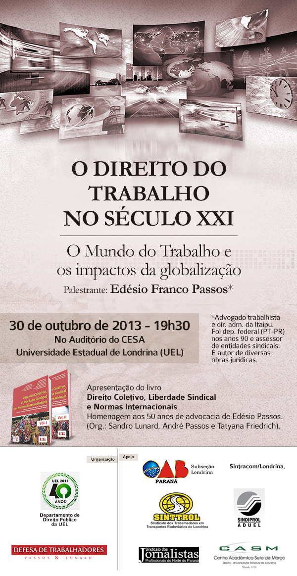 O palestrante será Edésio Franco Passos, advogado trabalhista e dir. adm. da Itaipu. Ele foi deputado federal (PT-PR) nos anos 90 e assessor de entidades sindicais. É autor de diversas obras jurídicas.