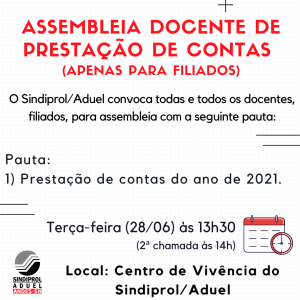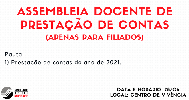 O Sindiprol/Aduel convoca todas e todos os docentes, filiados, para assembleia com a seguinte pauta: