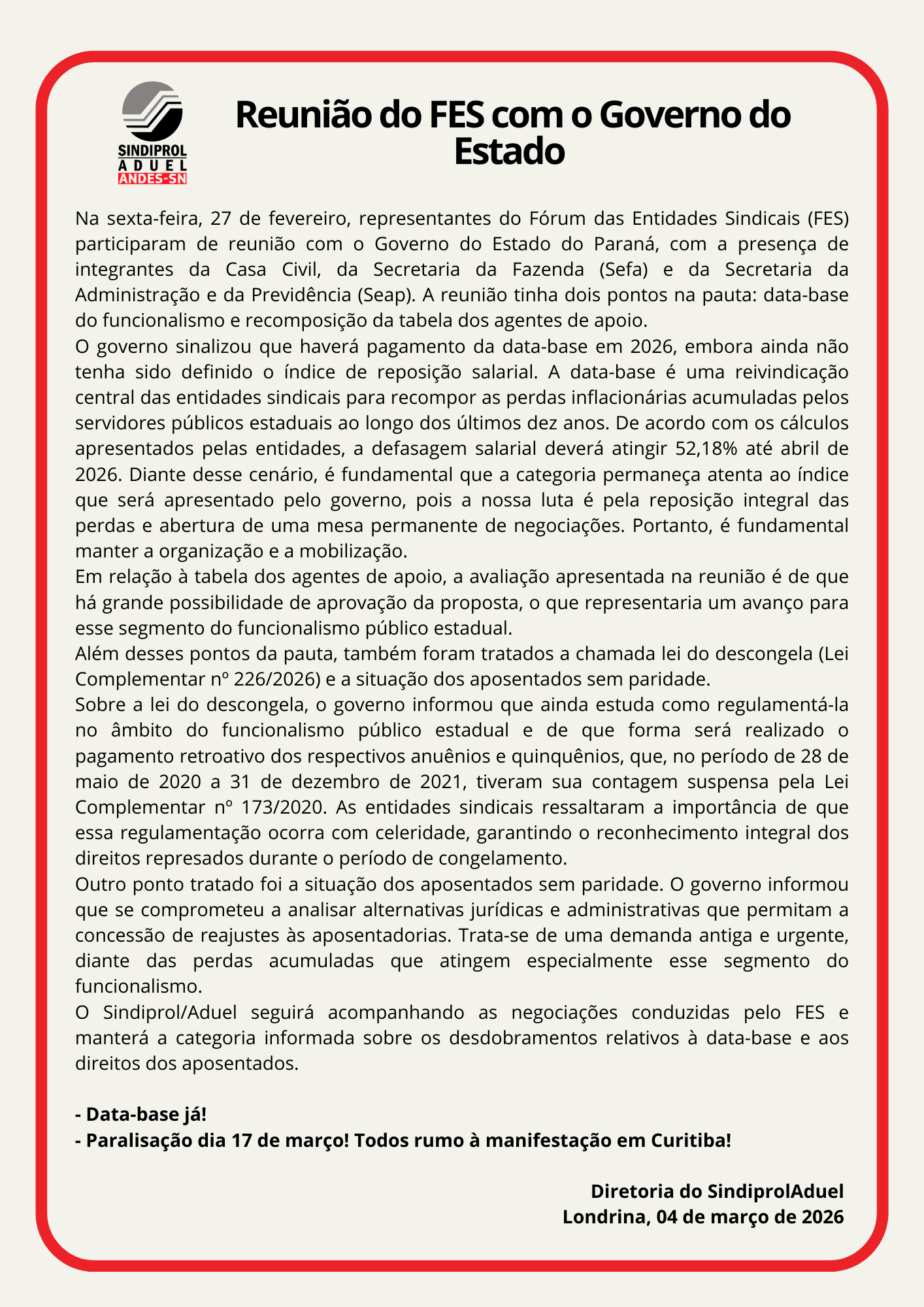 O Sindiprol/Aduel seguirá acompanhando as negociações conduzidas pelo FES e manterá a categoria informada sobre os desdobramentos relativos à data-base e aos direitos dos aposentados.