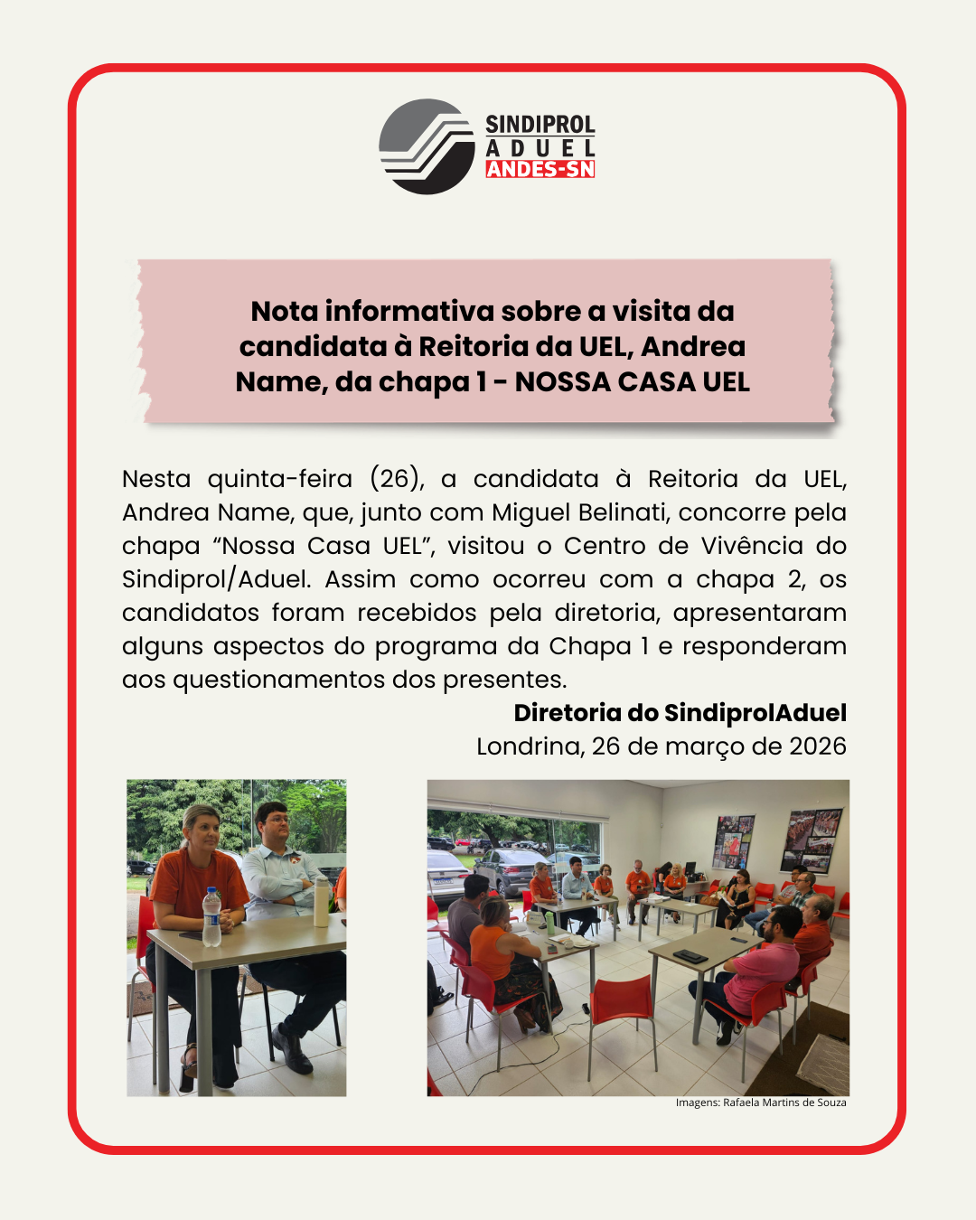 Na quinta-feira (12), o candidato à Reitoria da UEL, Sérgio Carlos de Carvalho, que, junto com Marta Regina Gimenez Favaro, concorre pela chapa “UEL Mais Forte”, visitou o Centro de Vivência do Sindiprol/Aduel. Recebido pela diretoria, o candidato expôs alguns aspectos do programa da Chapa 2 e respondeu a questionamentos dos presentes.