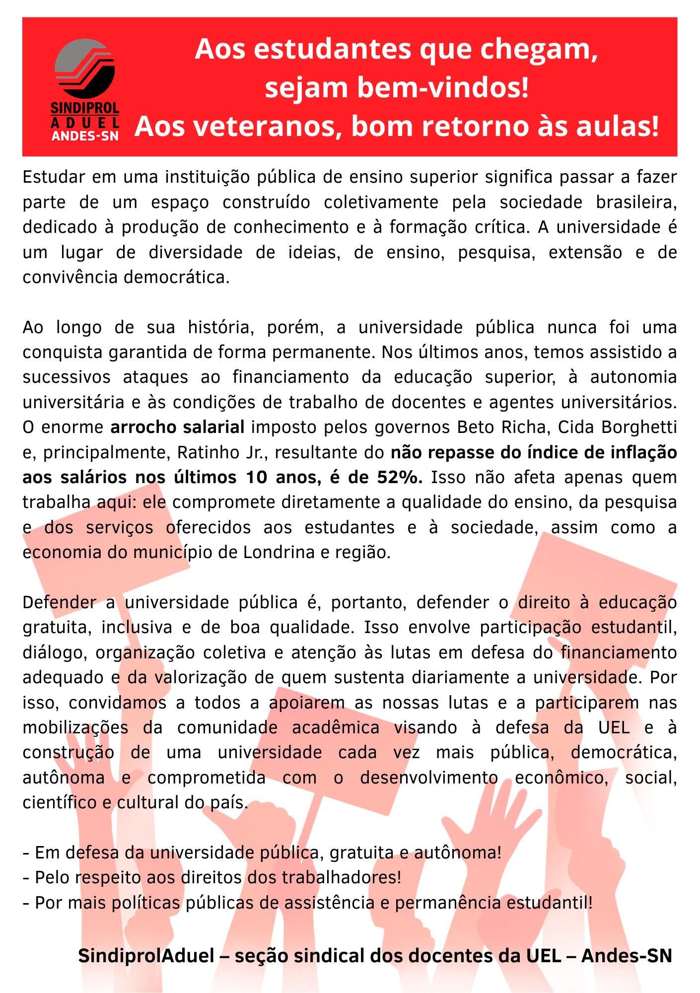 Diante disso, exigimos uma mesa de negociação visando à elaboração de uma proposta de reposição integral das perdas inflacionárias, ao respeito da data-base e à construção de uma política permanente de valorização da carreira docente. A universidade pública paranaense é patrimônio da sociedade. Sua defesa passa, necessariamente, pela valorização de quem a sustenta diariamente com trabalho intelectual, científico e formativo.