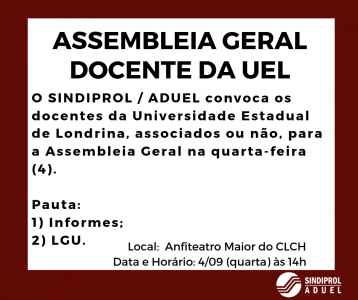 4 de setembro – Assembleia Docente da UEL com pauta LGU
