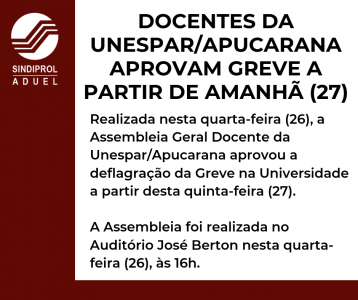 No caso da Unespar/Apucarana, a Assembleia Geral Docente deliberou pela deflagração da Greve a partir desta quinta-feira (27).